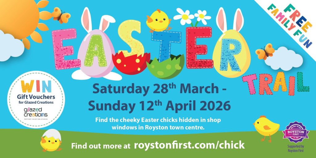 Join our Easter Trail to find the cheeky Easter chicks hiding in the windows of the Royston Town Centre shops, for a chance to win gift vouchers for pottery studio Glazed Creations.